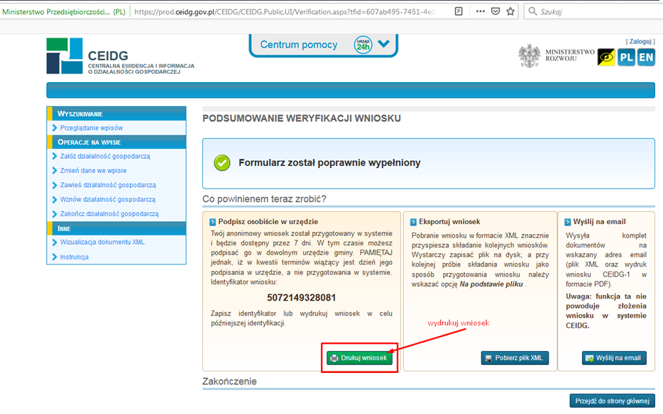 Krok 7. Jeśli wniosek zostanie poprawnie wypełniony pojawi się okno podsumowania wniosku CEIDG-1. Należy wydrukować wniosek, klikając przycisk drukuj wniosek