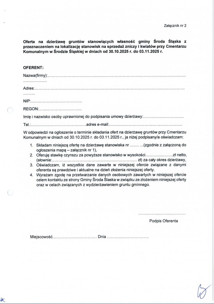 Ogłoszenie o terminie składania ofert na dzierżawę gruntów stanowiących własność gminy Środa Śląska z przeznaczeniem na lokalizację stanowisk na sprzedaż zniczy i kwiatów przy Cmentarzu Komunalnym w Środzie Śląskiej w dniach od 30.10.2025 r. do 03.11.2025 r.