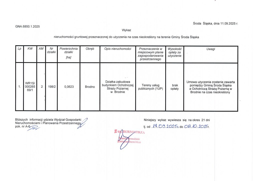 Wykaz nieruchomości gruntowej przeznaczonej do użyczenia na czas nieokreślony na terenie Gminy Środa Śląska