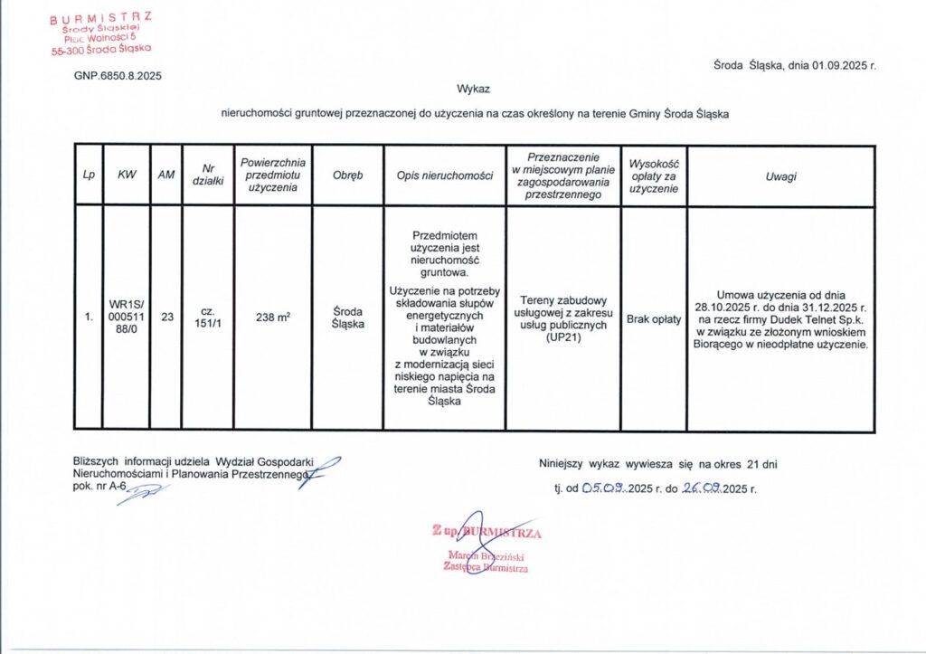 Środa Śląska > Aktualności > Komunikaty > Wykaz nieruchomości gruntowej przeznaczonej do użyczenia na czas określony na terenie Gminy Środa Śląska.