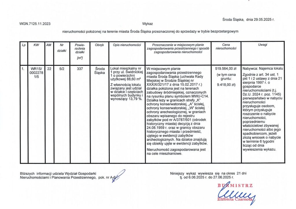 Wykaz nieruchomości położonej na terenie miasta Środa Śląska przeznaczonej do sprzedaży w trybie bezprzetargowym
