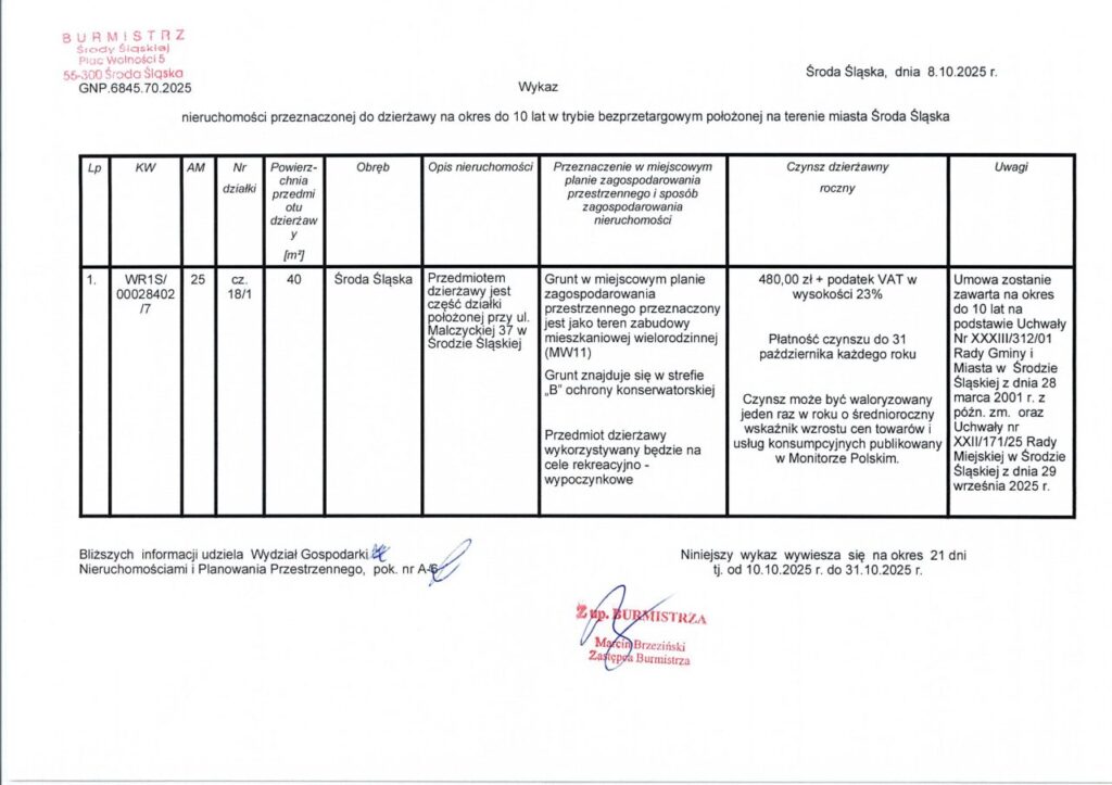 Wykaz nieruchomości przeznaczonej do dzierżawy na okres do 10 lat w trybie bezprzetargowym położonej na terenie miasta Środa Śląska