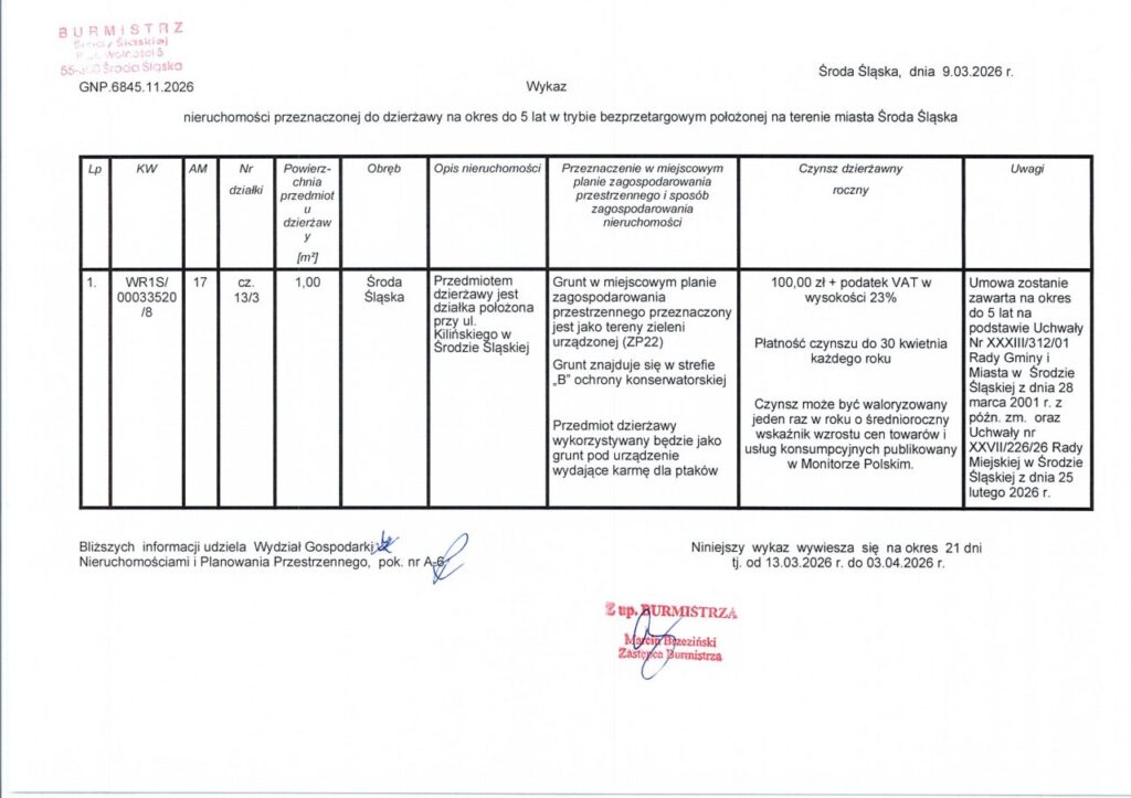 Środa Śląska > Aktualności > Komunikaty > Wykaz nieruchomości przeznaczonej do dzierżawy na okres do 5 lat w trybie bezprzetargowym położonej na terenie miasta Środa Śląska