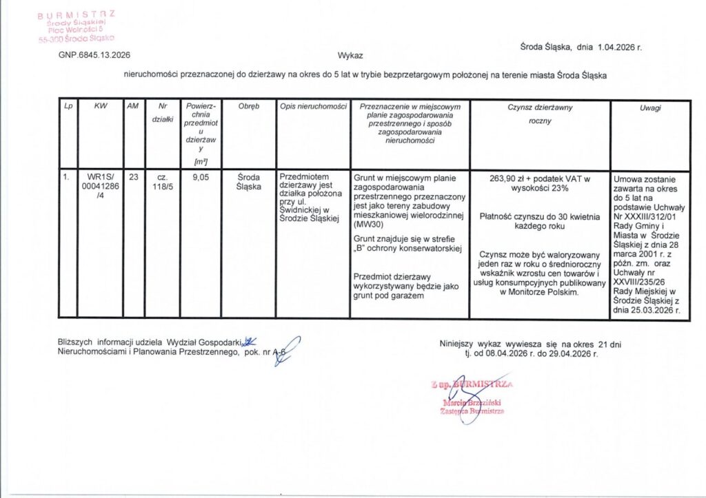 Środa Śląska > Aktualności > Komunikaty > Wykaz nieruchomości przeznaczonej do dzierżawy na okres do 5 lat w trybie bezprzetargowym położonej na terenie miasta Środa Śląska