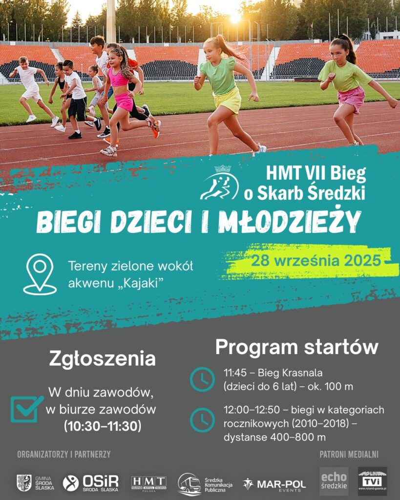 Zapraszamy wszystkie dzieci do 14. roku życia na specjalne biegi towarzyszące w ramach VII Biegu HMT o Skarb Średzki.